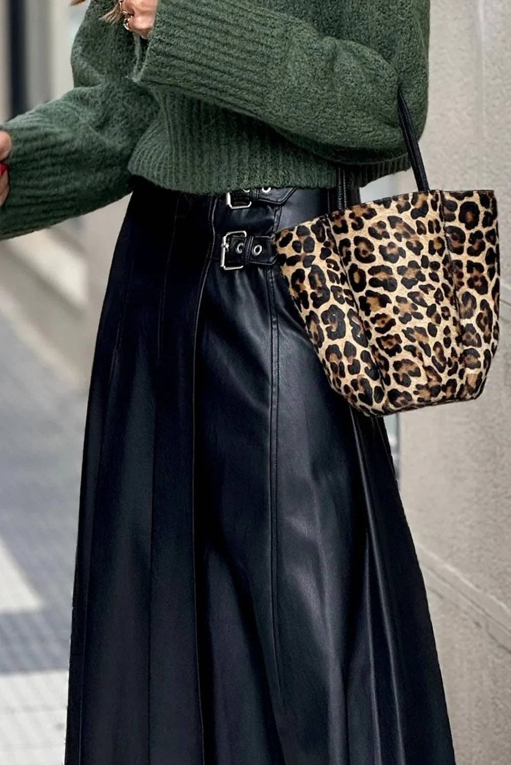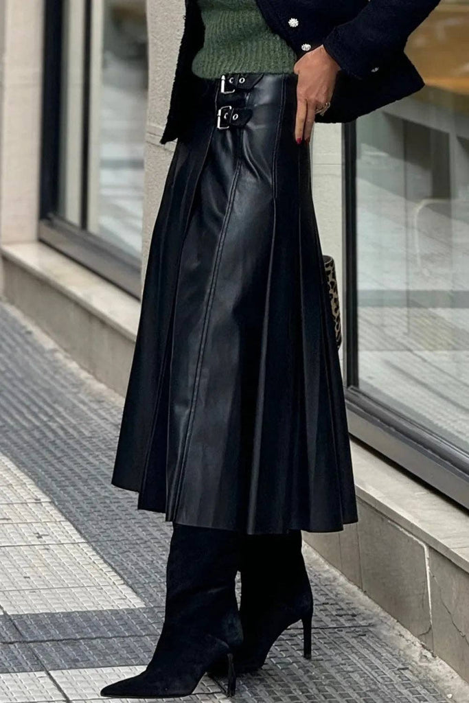 Black Faux Leather Retro Buckle Detail Pleated Stitch Flared Midi Skirt