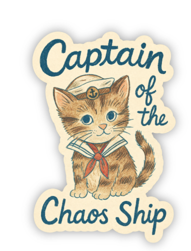 All aboard the chaos! This playful vinyl sticker features an adorable kitten dressed as a sailor, complete with a hat and necktie, alongside the phrase “Captain of the Chaos Ship.” Perfect for cat lovers, mischief makers, or anyone steering their own ship of silliness.