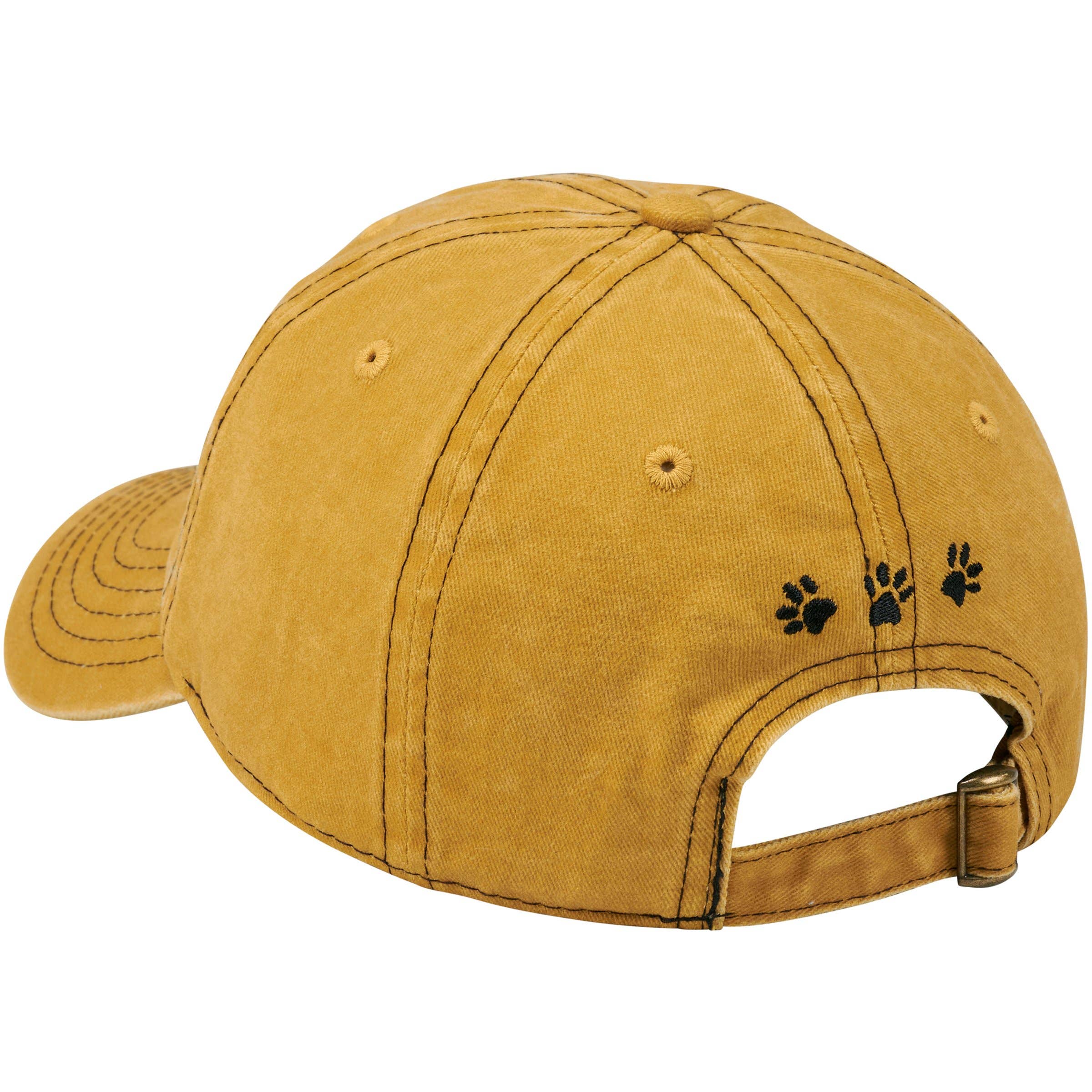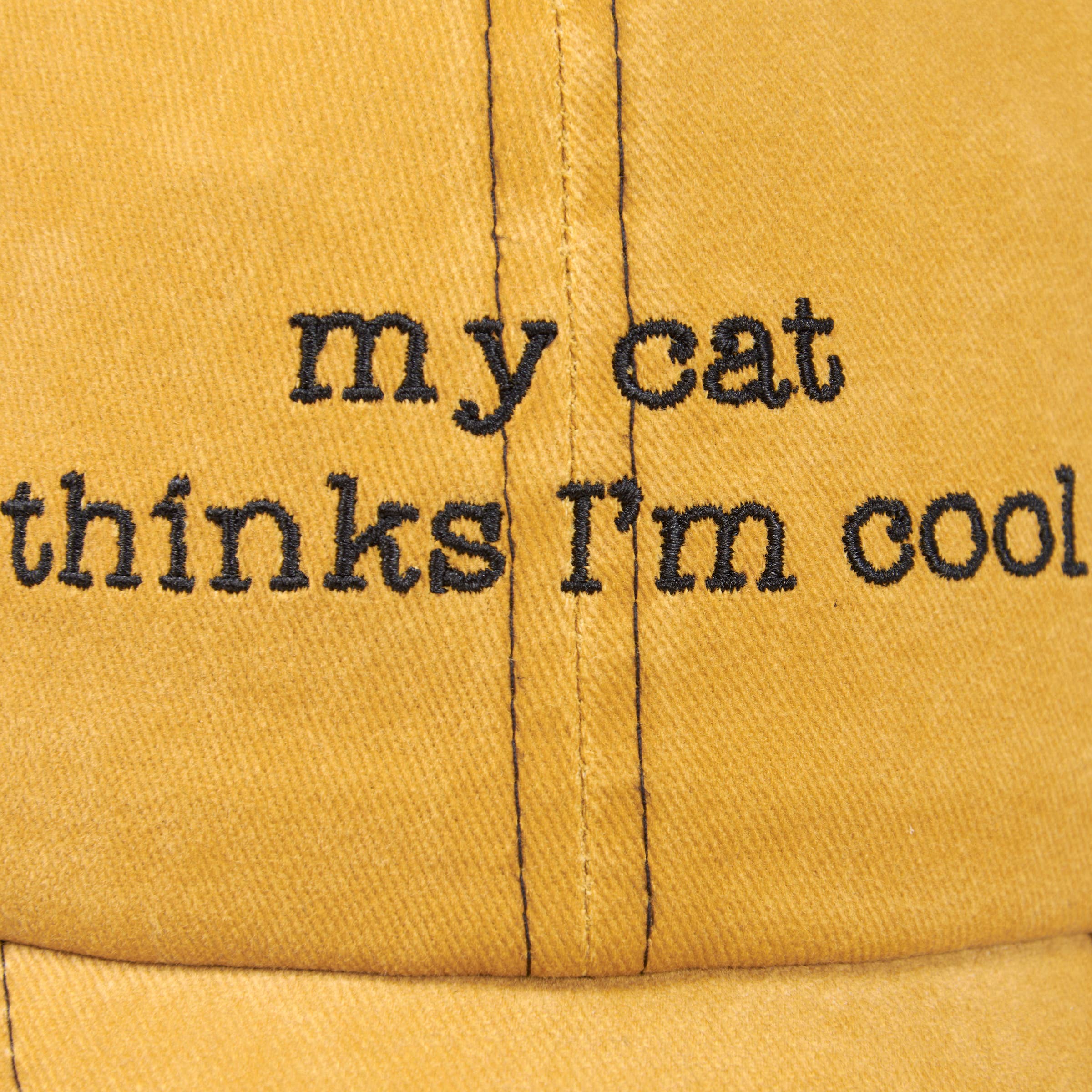 A gold baseball cap from our Pet Collection displaying a playful "My Cat Thinks I'm Cool" sentiment with paw prints design on the back and black thread accents. Cap features embroidered sentiment and design for added detail. Our My Cat baseball cap is one size fits most with an adjustable buckle closure to create the perfect fit. A fun pet-themed accessory to wear for everyday use. Hand wash only.