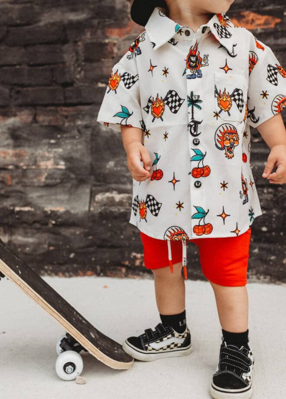 This crisp and colorful white button up turns all things LT into classic Americana flash. Think tattoo parlor meets ice cream run — cherries, flames, panthers, and palm trees. This shirt is INSANELY soft and lightweight with the perfect amount of stretch meaning no one getting hot or uncomfortable. Who said traditional formal wear had to be boring?