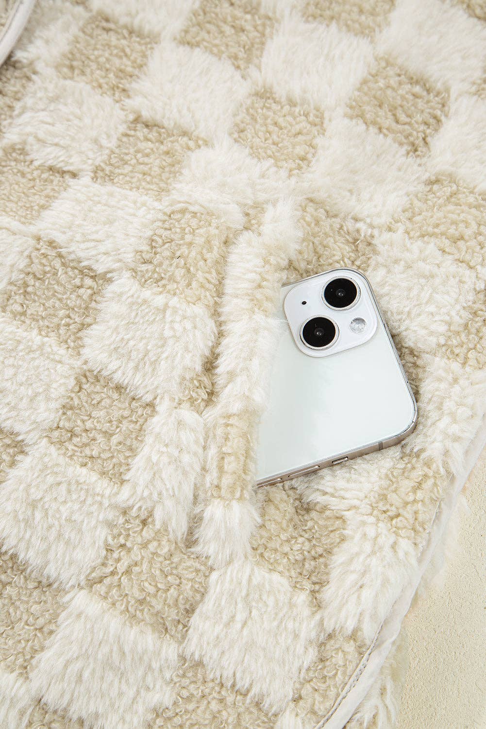 Khaki Sherpa Checkerboard Snap Button Vest Jacket With Pocket