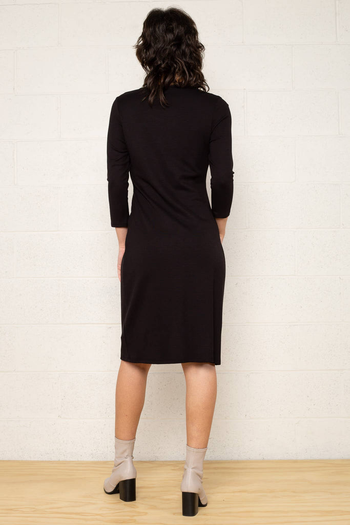 V-neck 3/4 sleeve dress with front pockets. Model is 5'8" and wearing a Small. Tumble dry low or lay flat to dry.