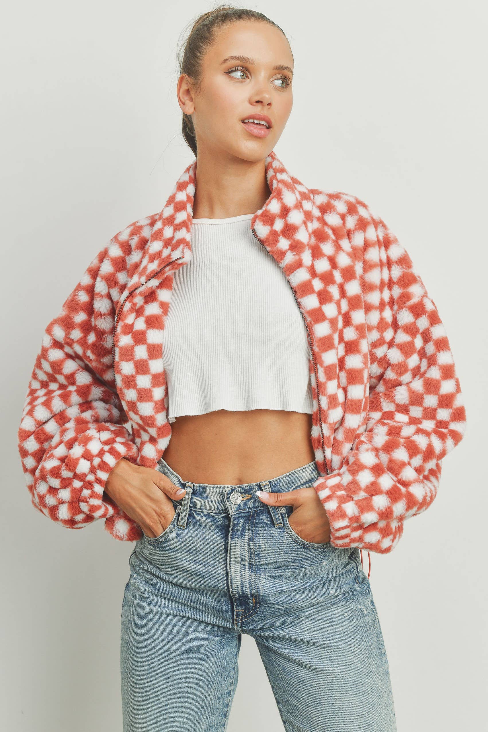 Introducing our Checker Teddy Fall Jacket – a cozy blend of fall comfort and trendy style. This jacket seamlessly combines a classic checker pattern with the plush warmth of teddy fabric, making it a must-have addition to your seasonal wardrobe. 100%POLYESTER The model is wearing a size S Model : 5'9" - B 31" - W 23 1/2" - H 35 1/2" PRE-PACK (3-2-1) SIZE AVAILABLE (S-M-L) Trending: Fall clothing, Halloween, holiday, Christmas, western apparel, Buttermelon
