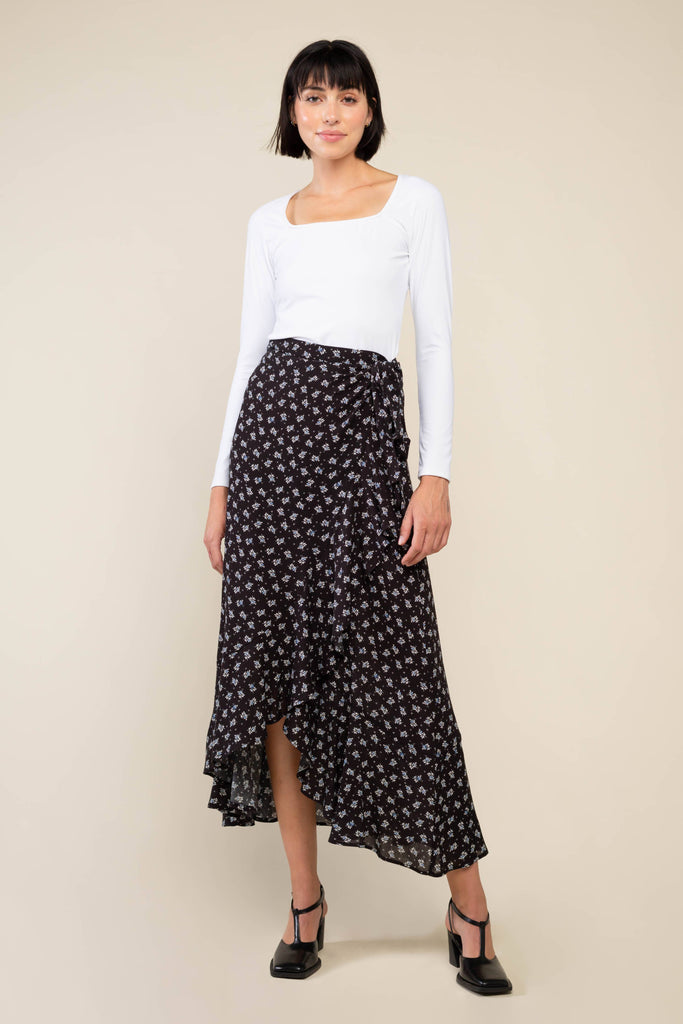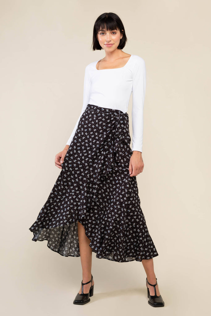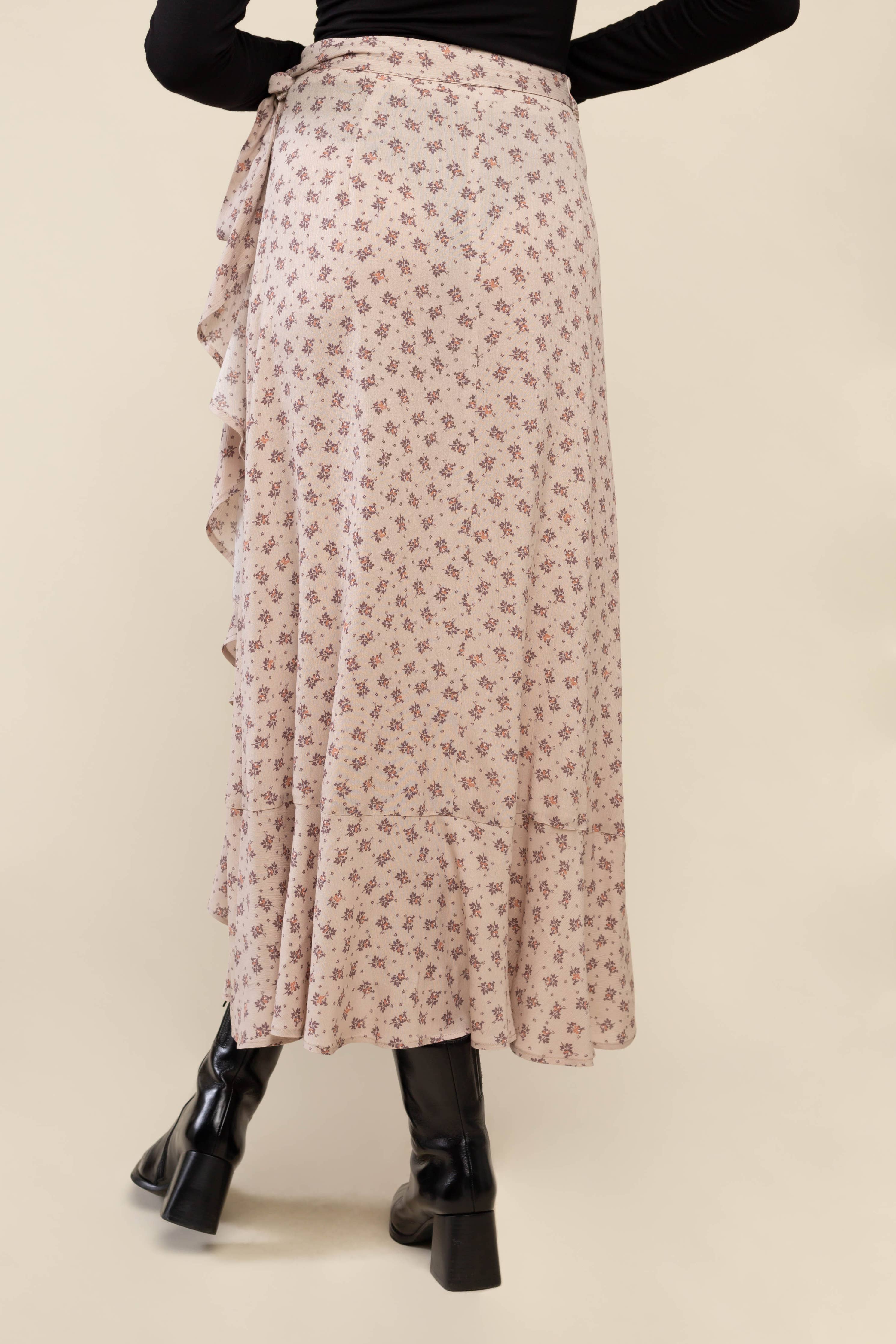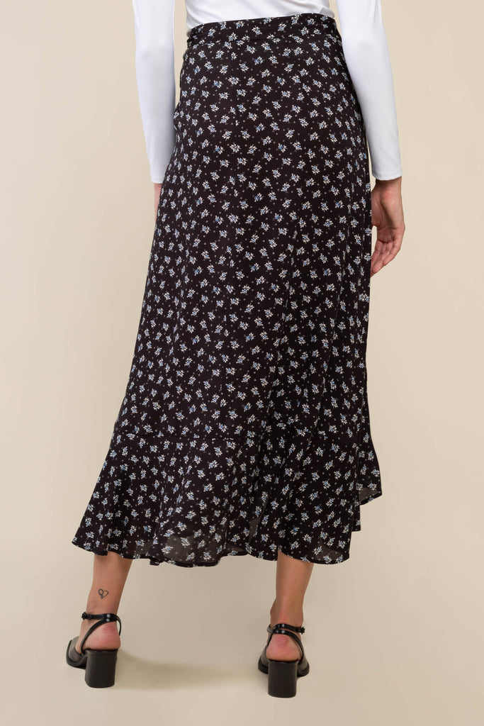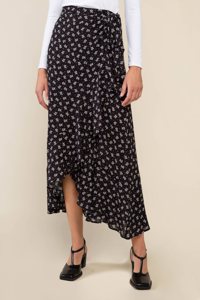 Tie wrap ditsy floral print skirt with ruffle hem detail