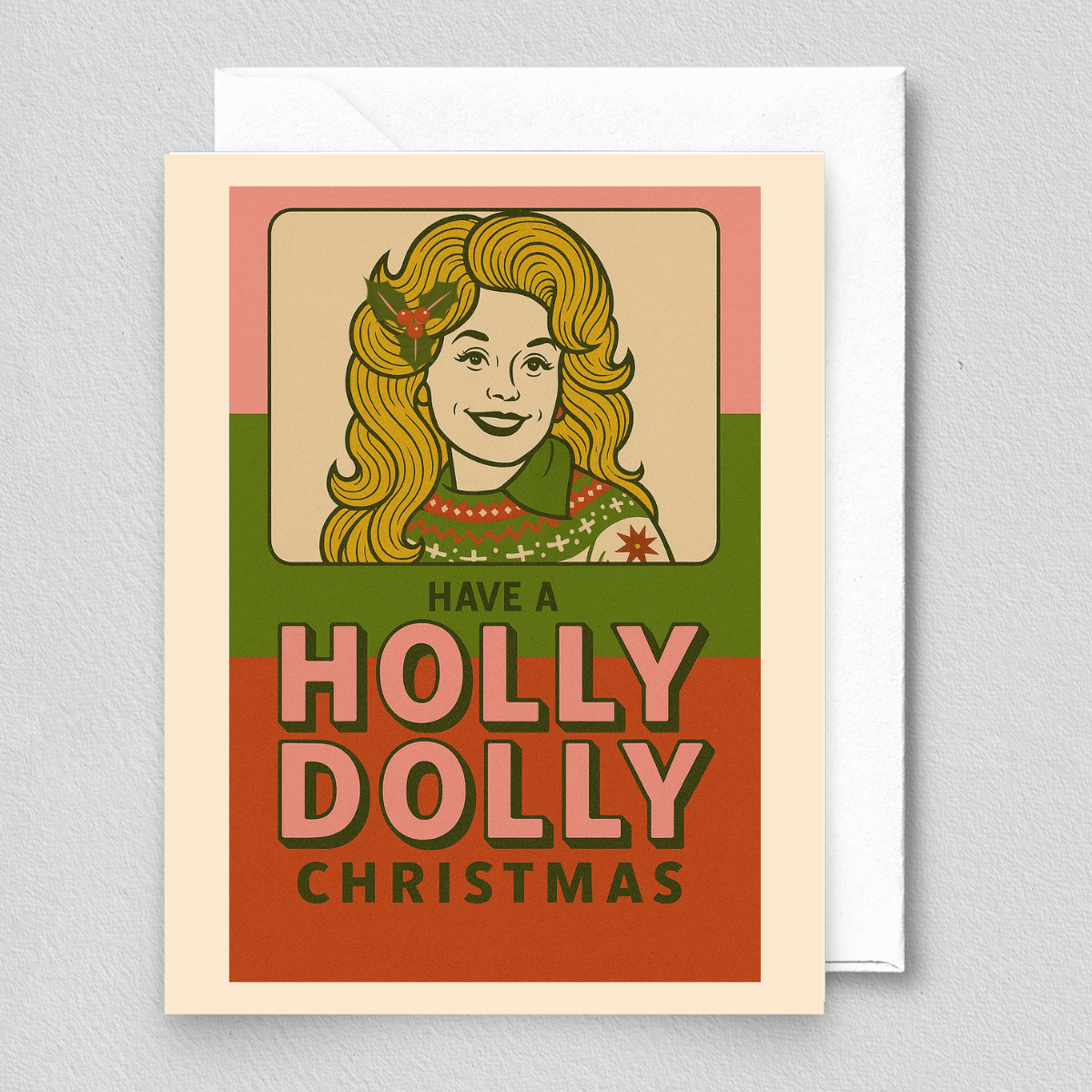 Celebrate the holidays with a little country charm using our Holly Dolly Christmas greeting card! This Dolly Parton inspired card features a retro-inspired illustration of the iconic Dolly Parton with festive lettering in warm holiday colors. Perfect for friends, family, or any Dolly fan, this card includes a matching envelope and is designed in Austin, TX, and printed in the USA. A fun and nostalgic way to spread holiday cheer, country style!