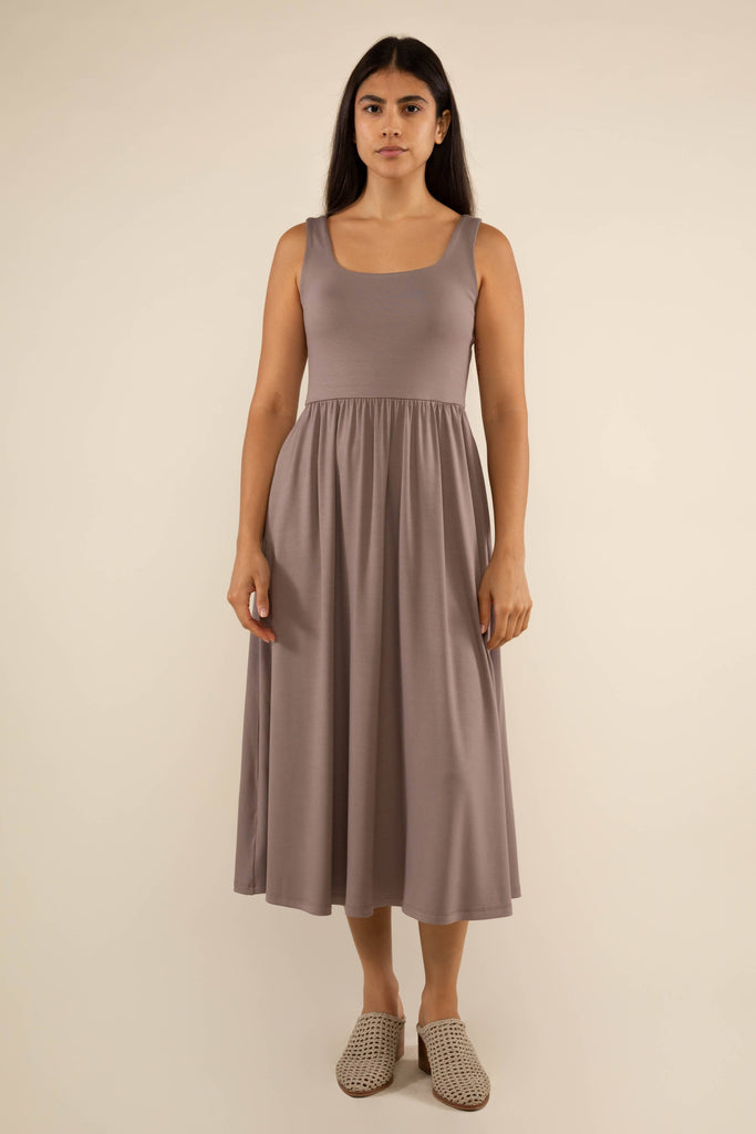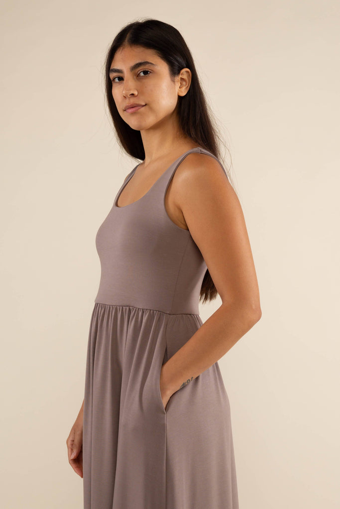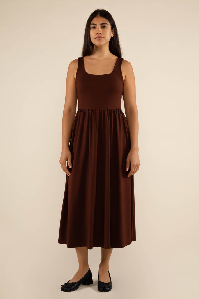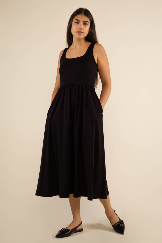 Midi sleeveless swing dress. The bodice is double layered for extra coverage and support, and features side pockets. It’s made from soft, heavy weight jersey that offers excellent stretch.