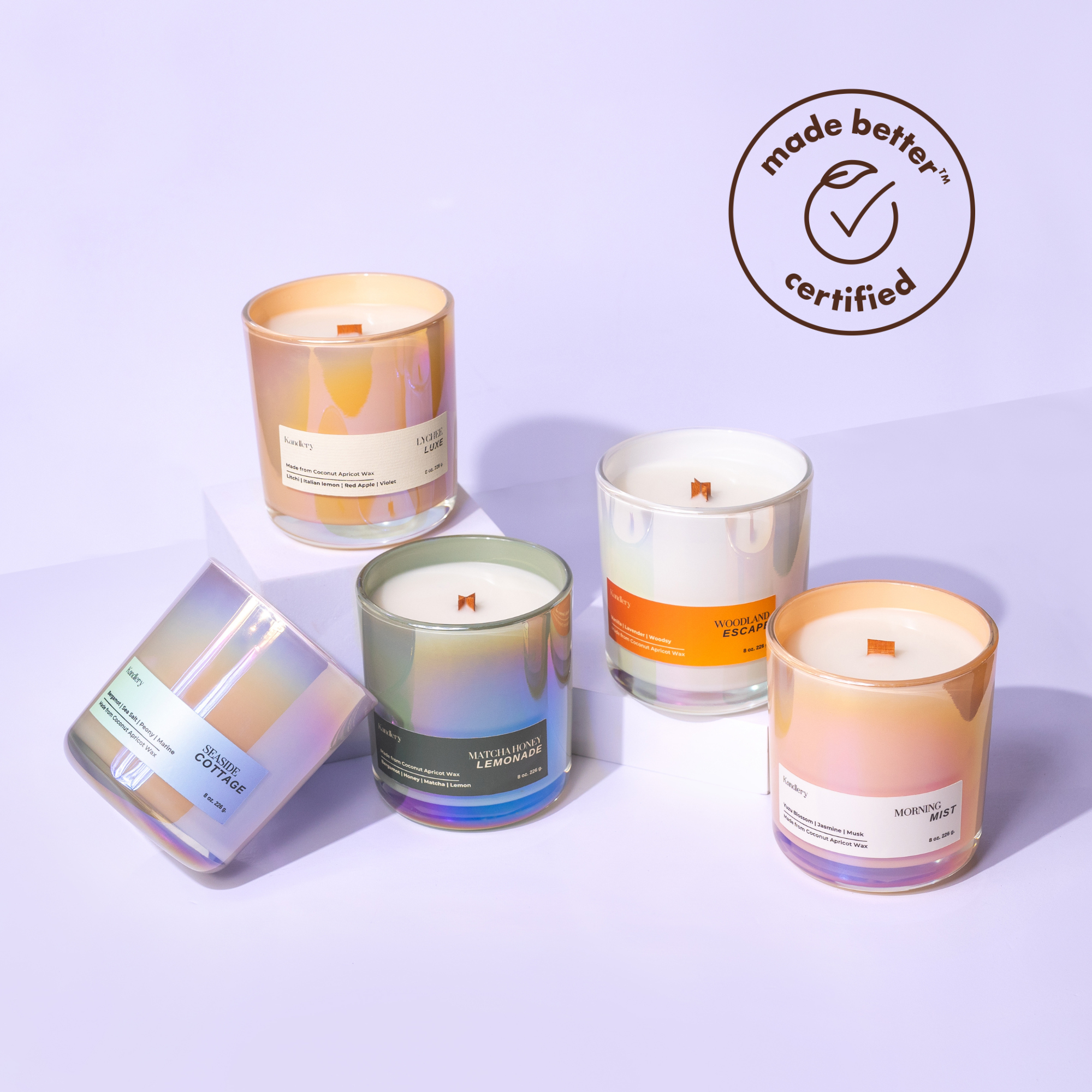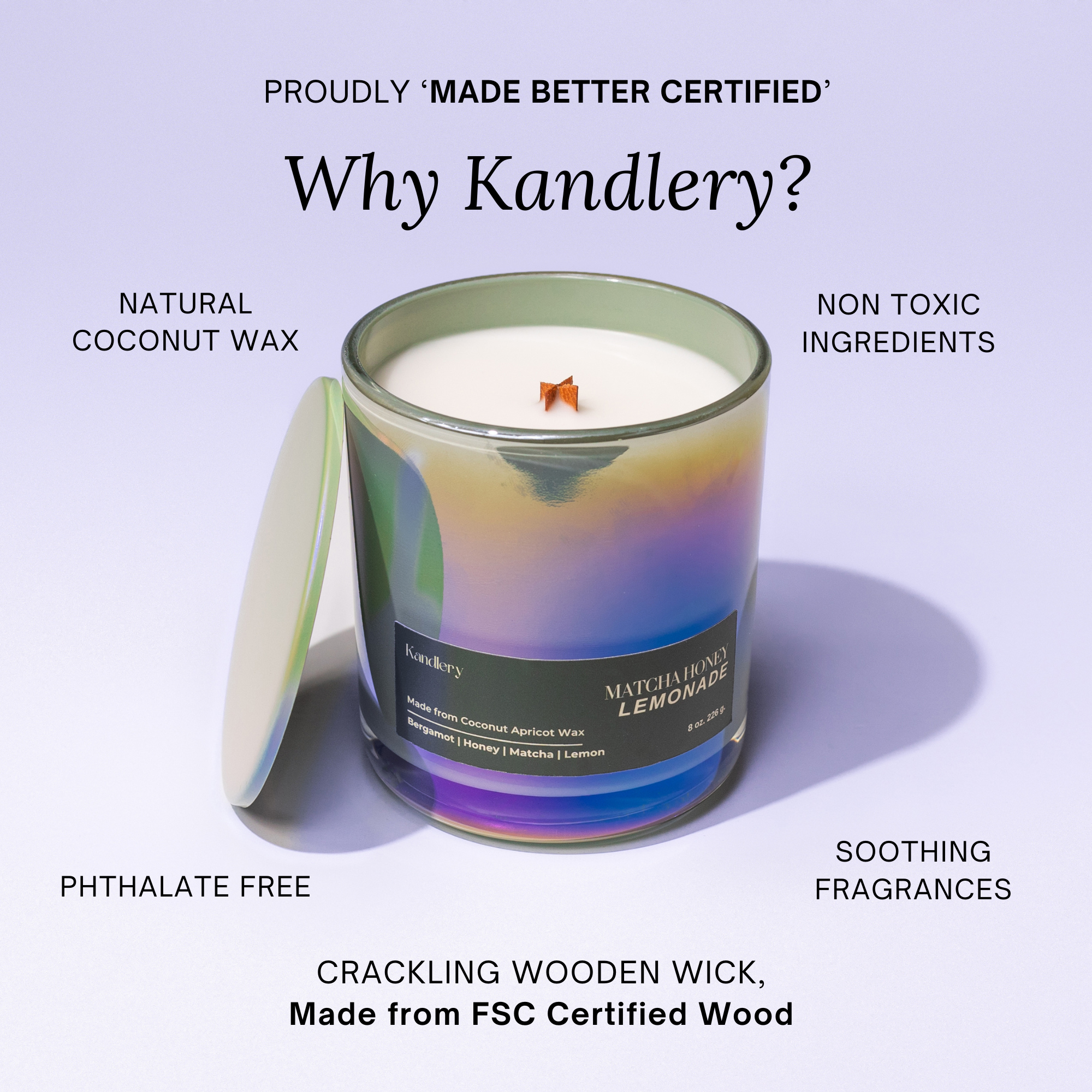 A blend of crisp lemon, cool mint, aromatic rosemary, calming lavandin, lush jasmine, and robust cedar creates a refreshing ambiance. Notes of yuzu blossom, lemon, mint, rosemary, lavandin, jasmine and cedar. Size options: 8 oz. wood wicked iridescent glass jar with a lid Non-toxic | cruelty-free | pet-friendly Proudly 'Made Better Certified'. Our goal is to source supplies with the highest quality standards in mind. Why Kandlery? - Natural Coconut Wax - Crackling Wooden Wick, Made from FSC Certified Wood. - Lead free & Self-trimming Cotton Wick - Non Toxic Ingredients - Premium Soothing Fragrances (Free of phthalate, reproductive toxins, and other concerning chemicals.) - Cruelty Free - Handcrafted in Small Batch - Untapped Asian-inspired scents