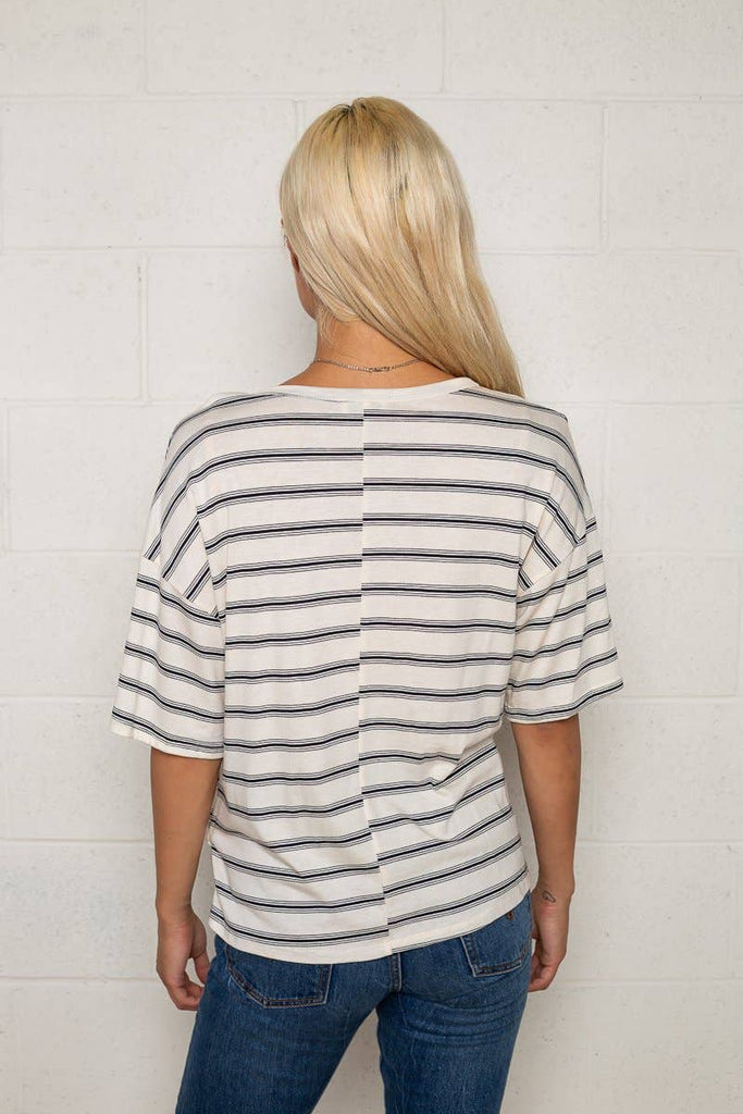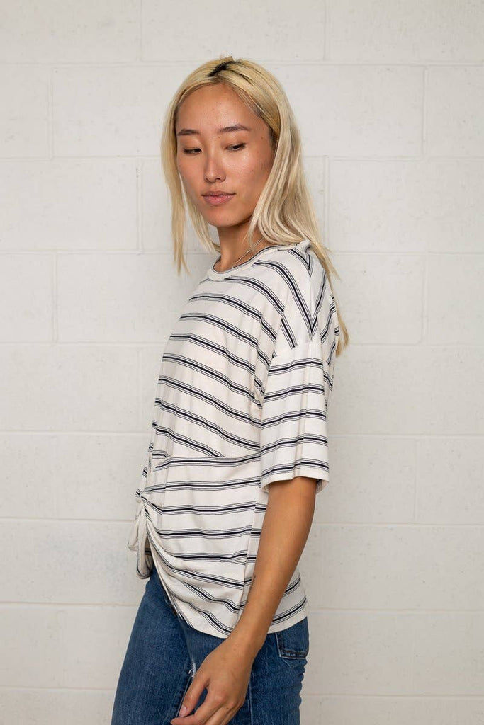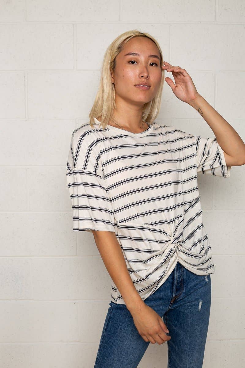 Front twist striped boxy tee. Model is 5'8" and wearing a Small. Tumble dry low or lay flat to dry.