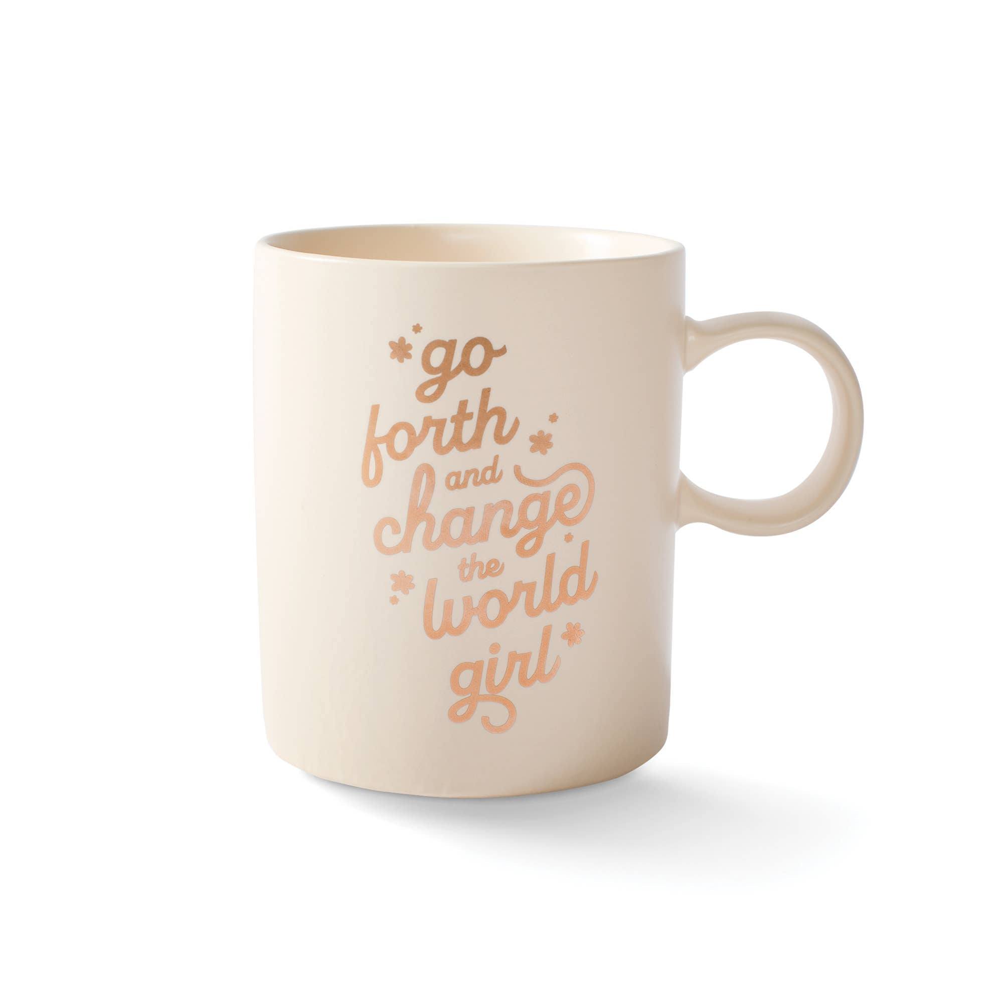Ceramic with matte color glaze and gold metallic art. 3.5” diameter x 4.25” high mug holds approximately 14 fluid ounces.