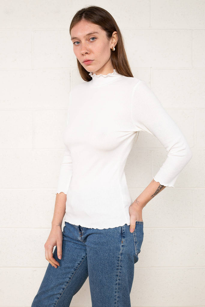 Lettuce edge rib 3/4 sleeve. Model is 5'8" and wearing a Small. Tumble dry low or lay flat to dry.